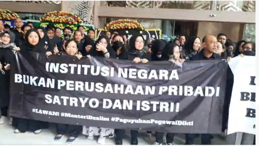 Mereka menamakan Aksi Damai Senin Hitam, membentangkan spanduk bertuliskan “Institusi Negara Bukan Perusahaan Pribadi Satryo dan Istri”, ada pula yang bertulisan bernada menyindir “Kami ASN Dibayar Oleh Negara, Bekerja Untuk Negara Buka Babu Keluarga.” Sejumlah karangan bunga juga nampak dengan kalimat yang tegas “Lawan Mentri Dzalim!”. Satu spnaduk besar terpampang di pagar Kemdiktisaintek meminta Presiden Prabowo turun tangan dengan kalimat; “Pak Presiden, Selamatkan Kami dari Menteri Pemarah, Suka Main Tampar dan Main Pecat.